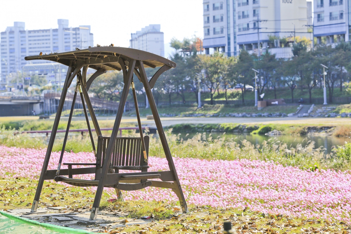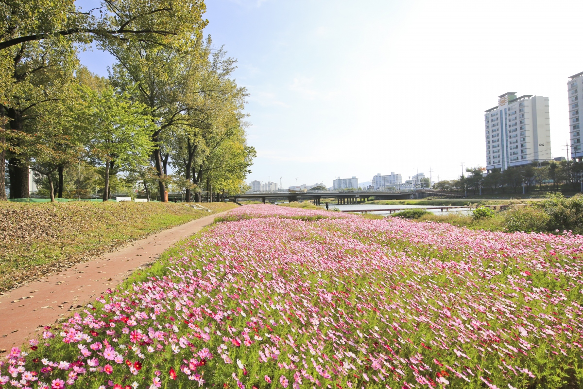 가을 향기 물씬 풍기는 코스모스가 빨강, 분홍, 하양 등 각각의 색으로 보강천을 물들이고 바람에 따라 하늘거린다.