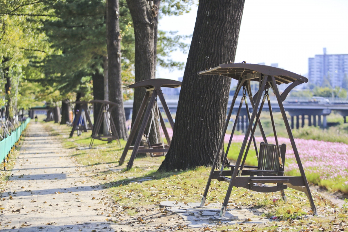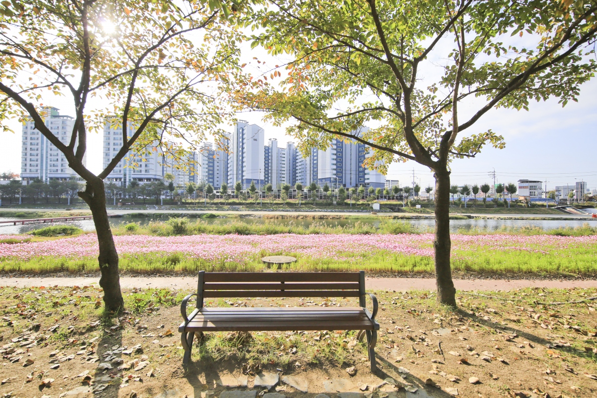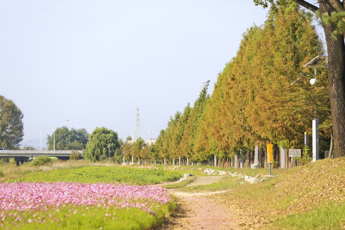 보강천을 찾는 사람들이 꽃과 나무를 보며 쉴 수 있도록 계절별로 피어나는 꽃과 길쭉한 미루나무가 어우러져 한 폭의 아름다운 풍경화를 연출한다.