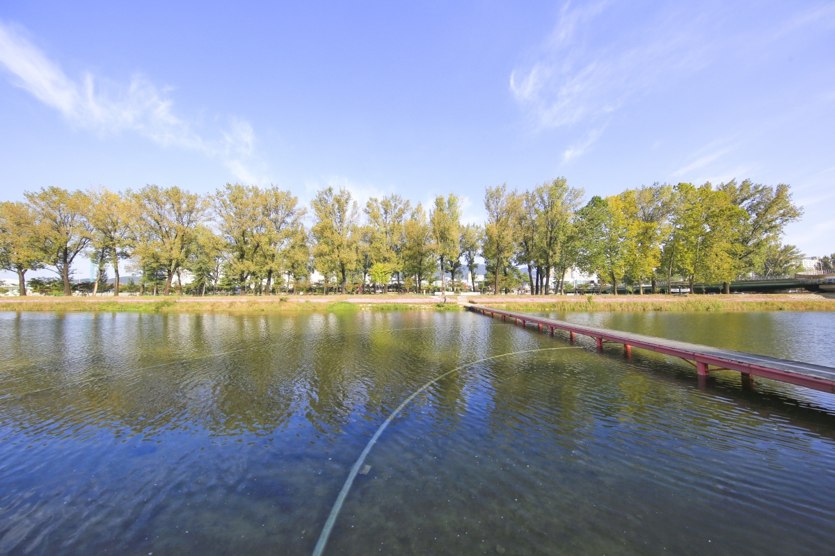 미루나무가 줄지어 늘어선 하천가를 깨끗하게 정비하여 사람들이 편안하게 걸을 수 있는 공간으로 산책로를 조성하였고,