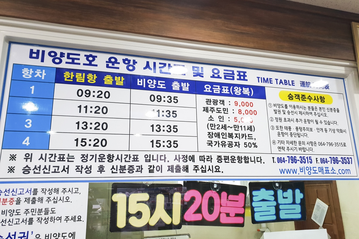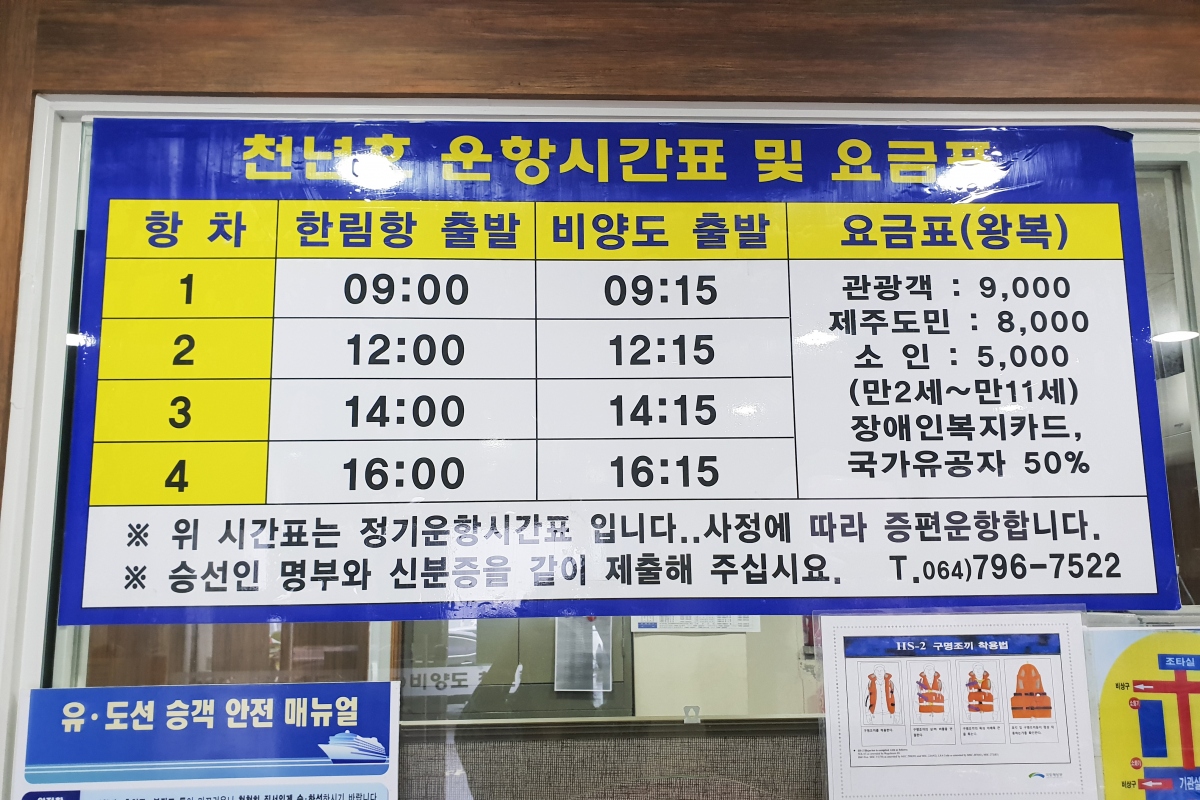 비양도로 들어가는 배편은 한림항이 아니라 한림해양파출소 옆에 있는 한림항도선대합실에서 비양도호와 천년호가 각각 하루 4번 운행되는 배편을 타고 들어갈 수 있다
