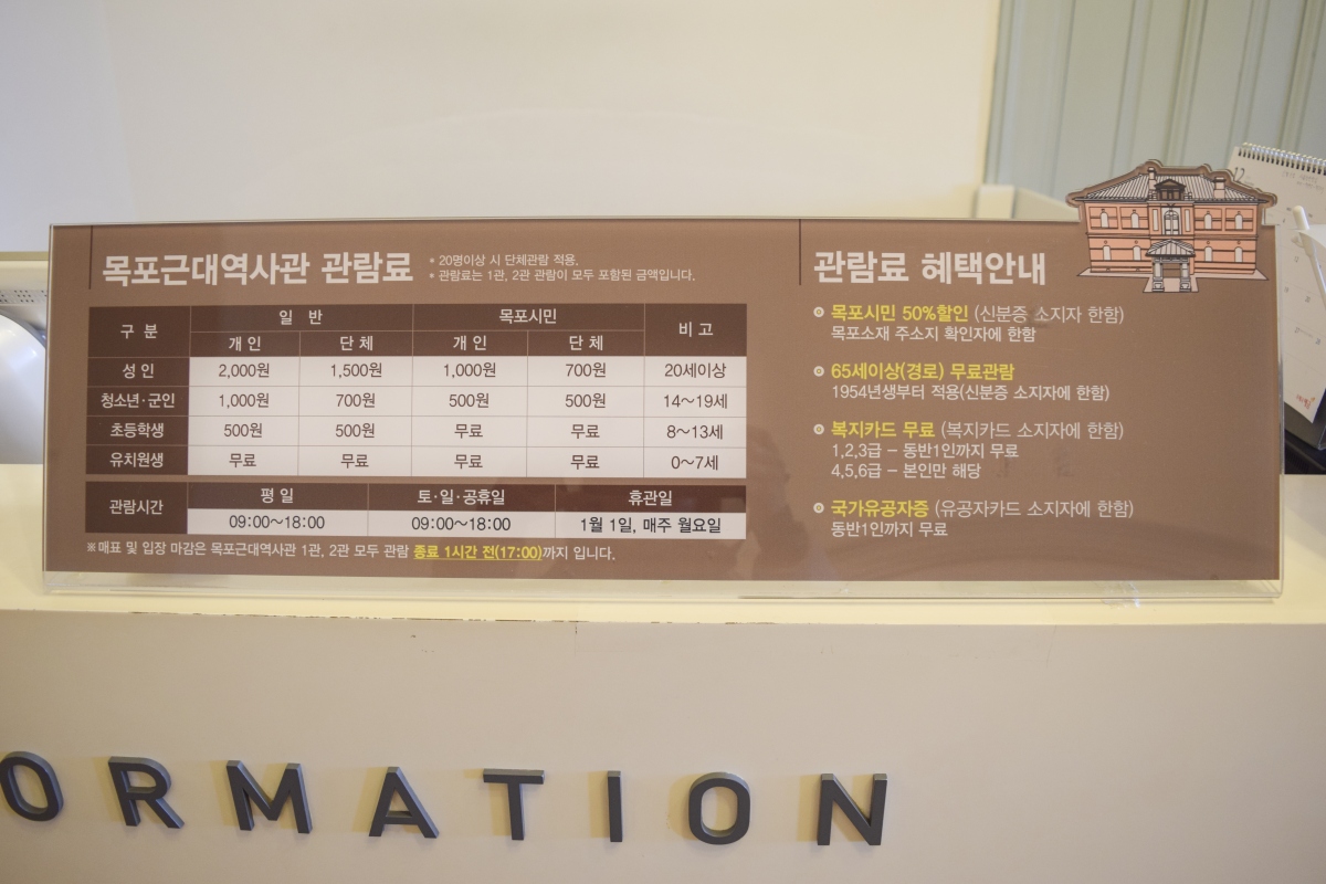 | 입장료 | 일반: 어른2,000원 / 청소년 및 군인1,000원 / 초등학생500원 / 유치원생 무료 단체(20명이상): 어른1,500원/ 청소년 및 군인700원/ 초등학생500원/ 유치원생무료 (목포시민에 한해 관람료 50% 감면 및 목포 관내 초등학생 이하 무료) |