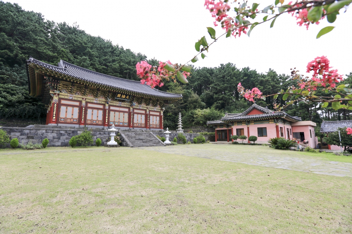 사천왕문을 지나면 분홍색 배롱나무꽃이 대웅전 법당과 어우러진 모습이 한 폭의 그림처럼 아름답다.