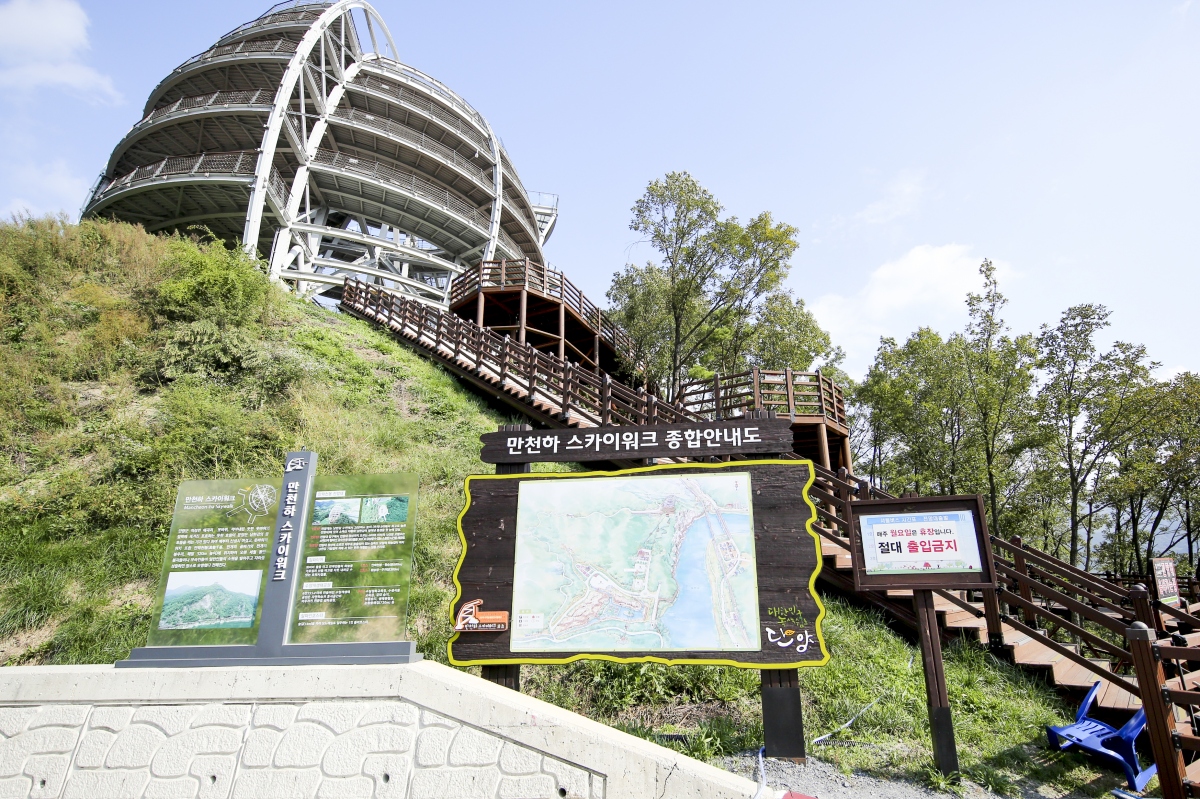 남한강 수면에서 우뚝 솟아 있는 만천하스카이워크는 지상 30미터 스카이워크 전망대와 980미터 규모의 짚와이어, 960미터 길이의 알파인코스트로 나누어져 있다.