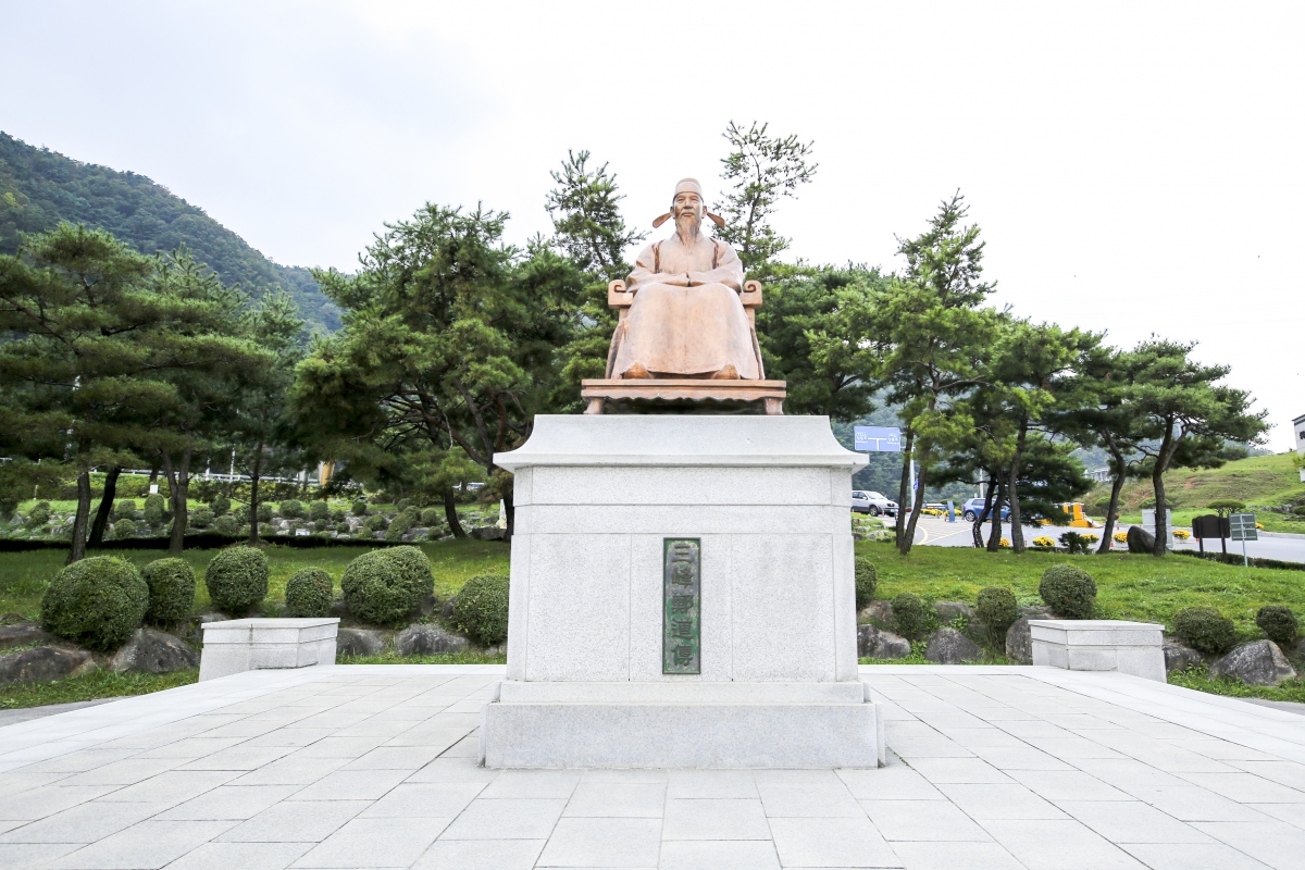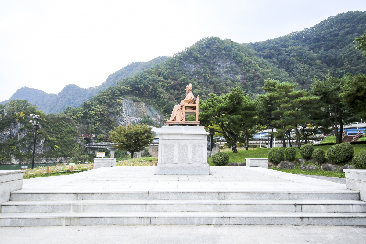 도담삼봉 한쪽에는 의자에 앉아 삼봉을 바라고 있는 정도전의 동상이 세워져 있다.