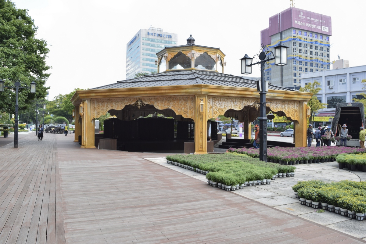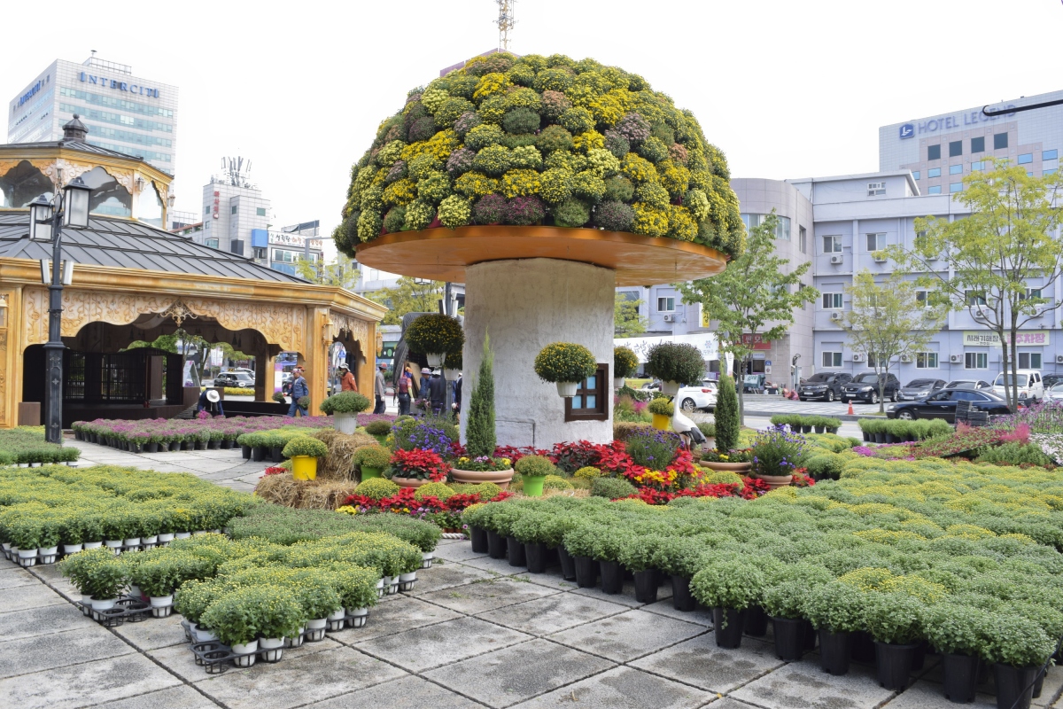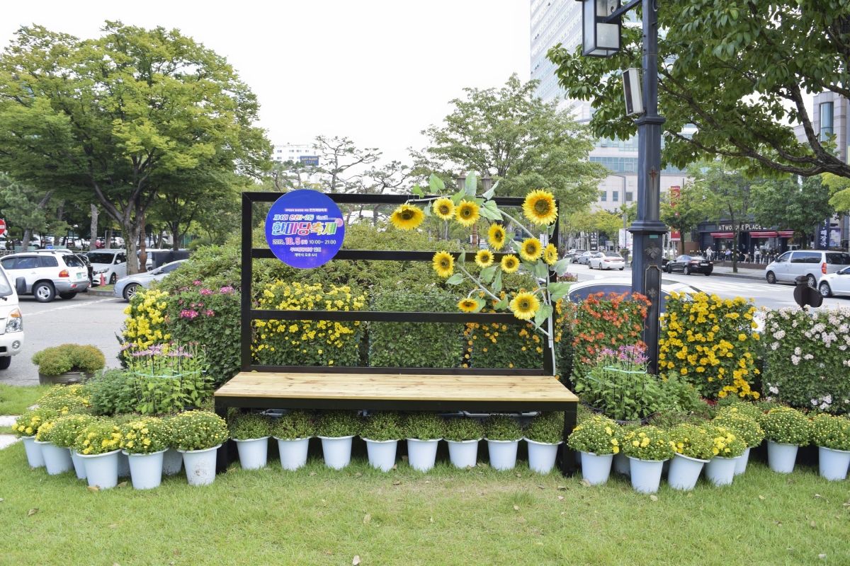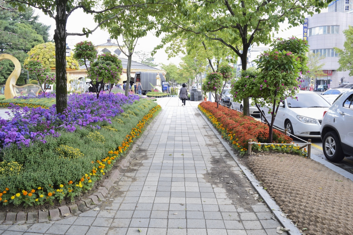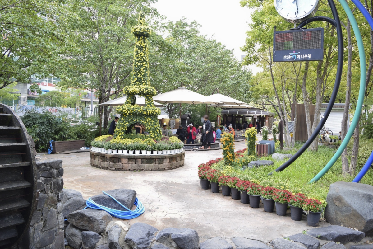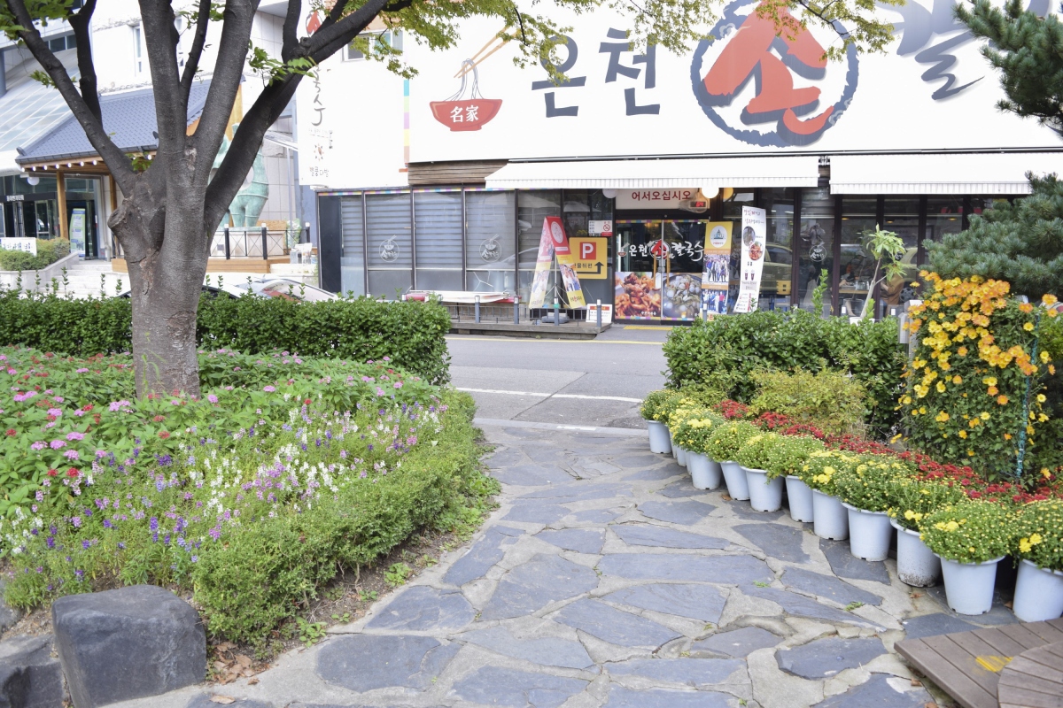 알록달록하게 꾸며진 꽃밭이 회색빛 도시의 이미지를 정화시켜 주듯 잘 가꾸어진 유성온천공원 테마거리는 날씨가 따뜻해지면 많은 사람들이 족욕을 즐기기 위해 찾는 곳이다.