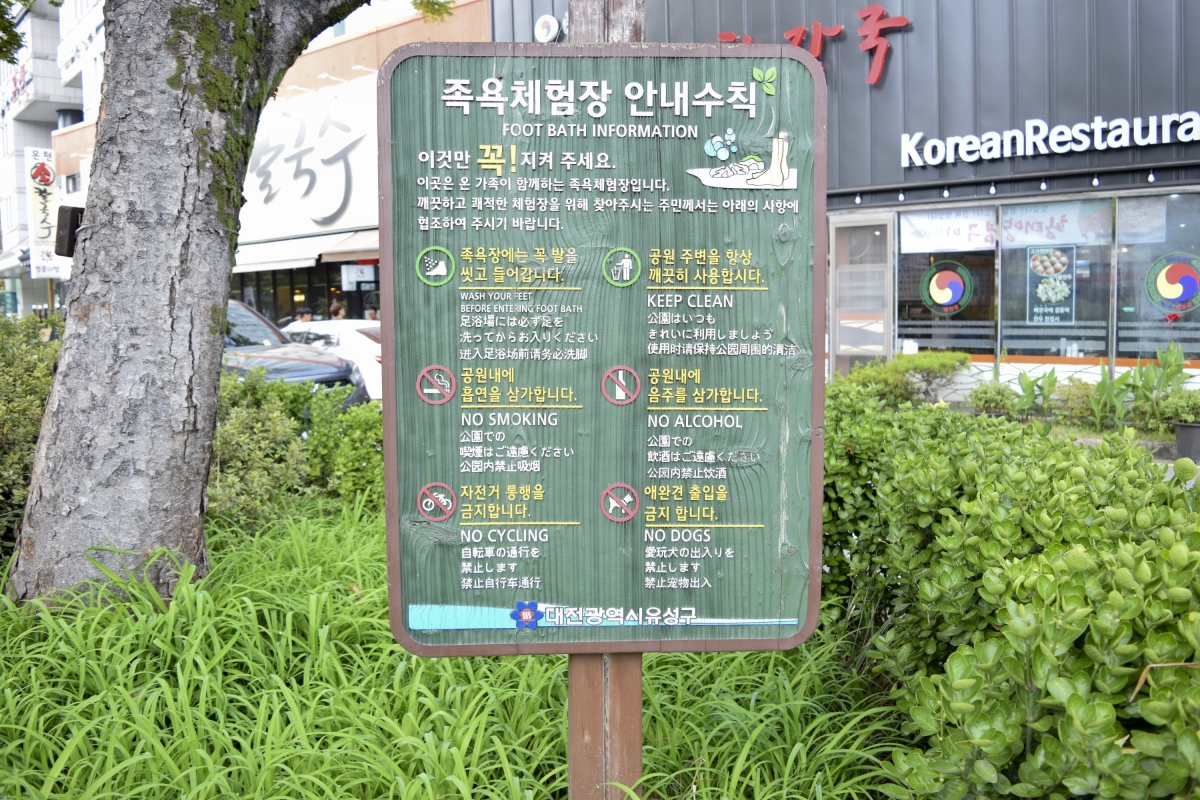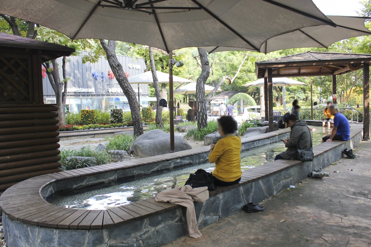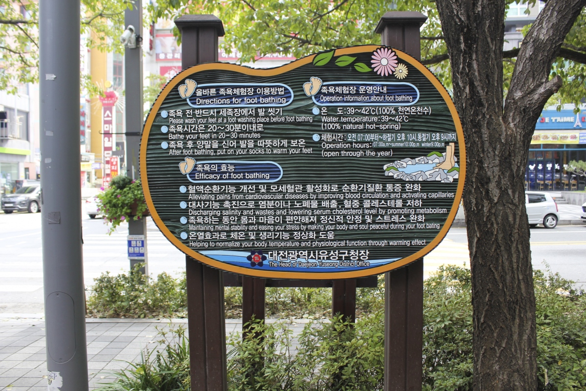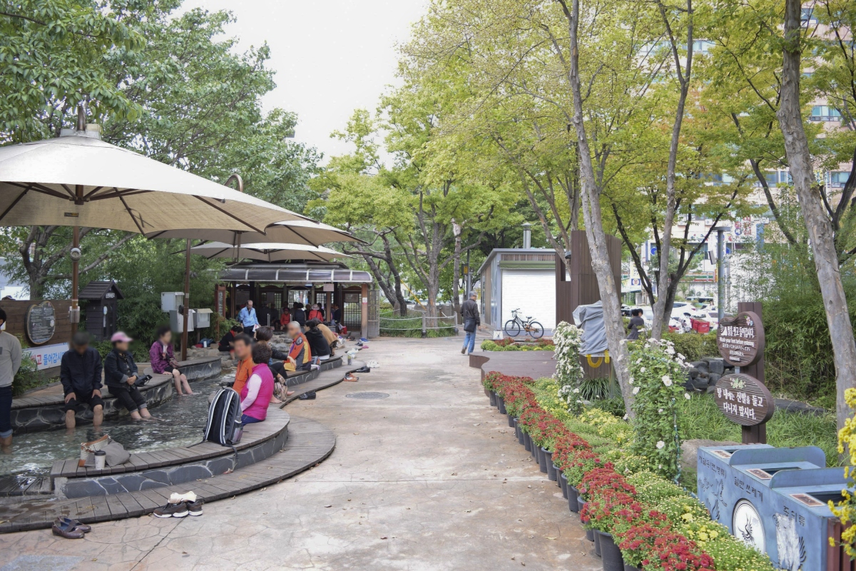유성온천특구로 지정된 온천관광지 도심 한복판에 사철 뜨끈뜨끈한 온천수가 콸콸 흐르는 족욕탕은 무료로 개방되어 있어