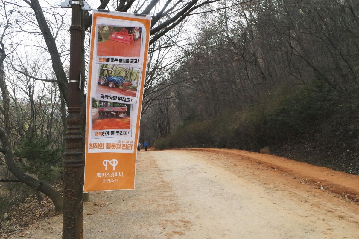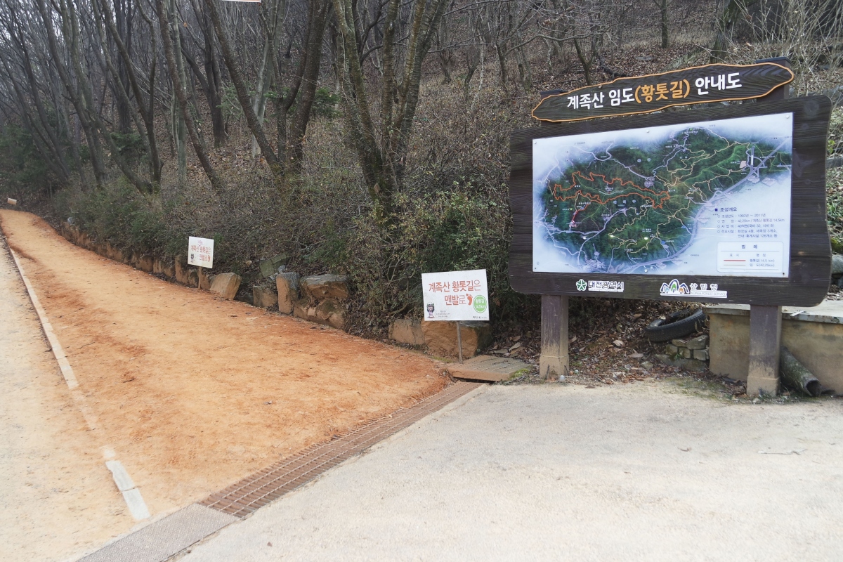 이 산의 묘미는 계족산장동산림욕장 입구부터 산을 한 바퀴 도는 14.5키로미터의 황톳길이다.
