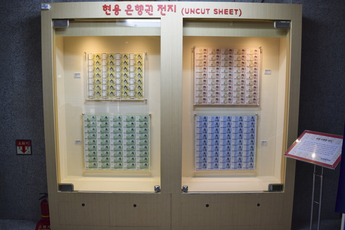 우리가 사용하는 5만원, 1만원, 5천원, 1천원이 잘라지지 않은 상태인 전지의 형태로 전시되어 있다.