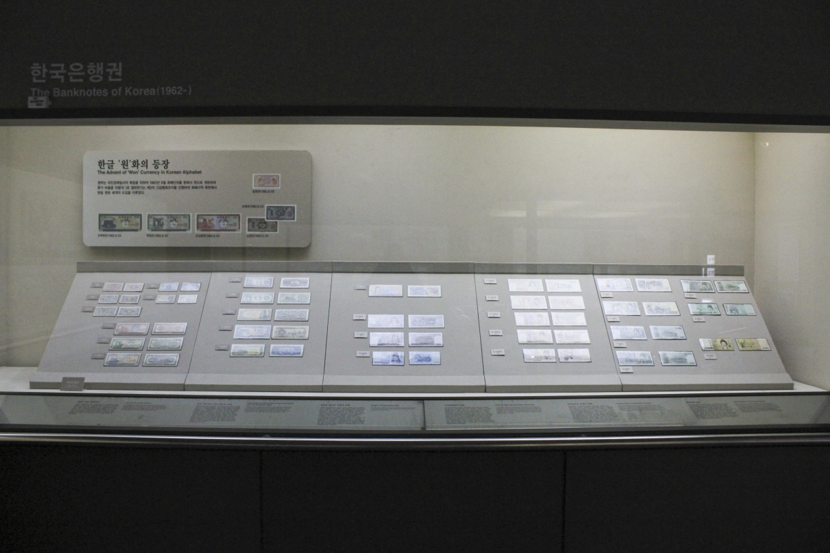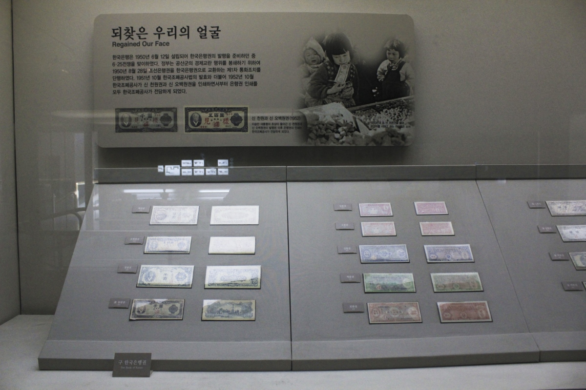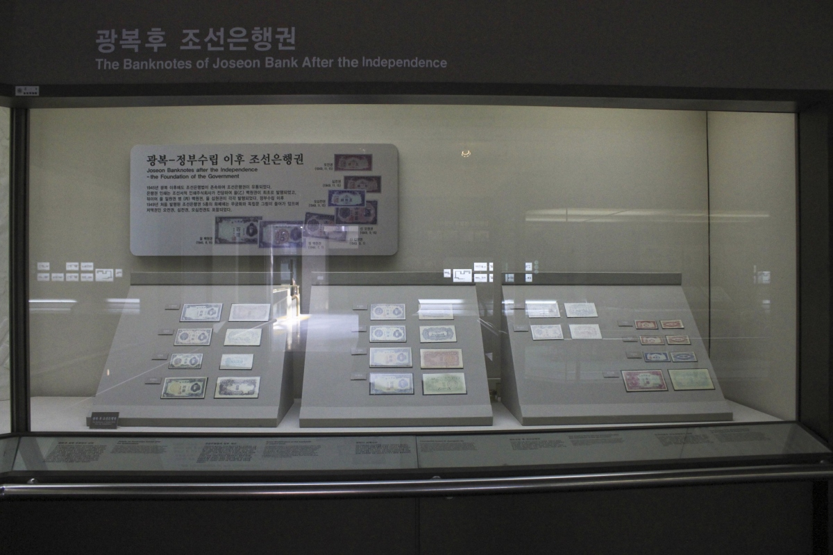그 옆으로는 광복 후 조선은행에서 만든 화폐와 1950년 한국은행 설립을 통하여 조폐공사에서 처음 만든 천원, 오백원권을 볼 수 있는데