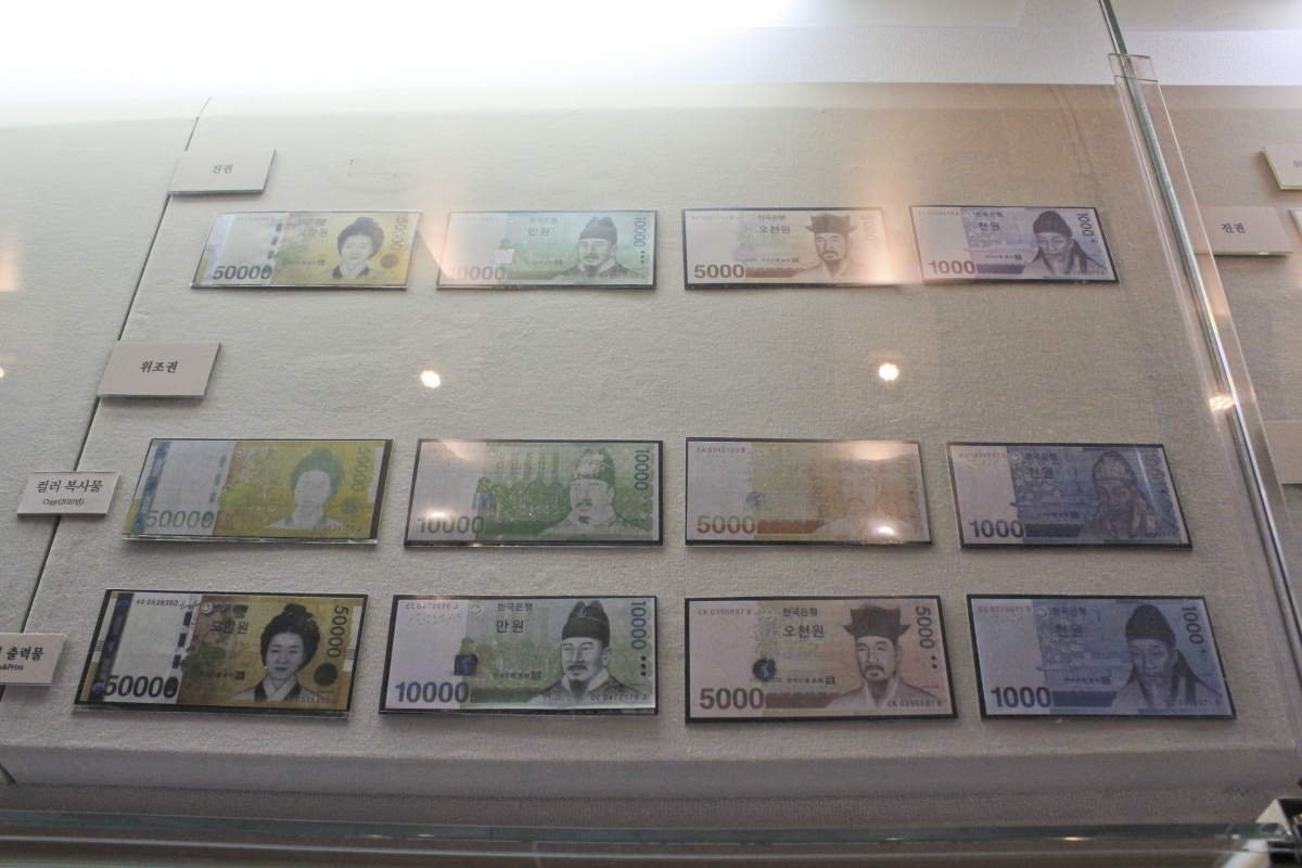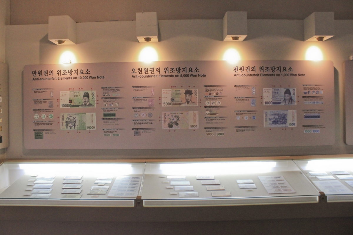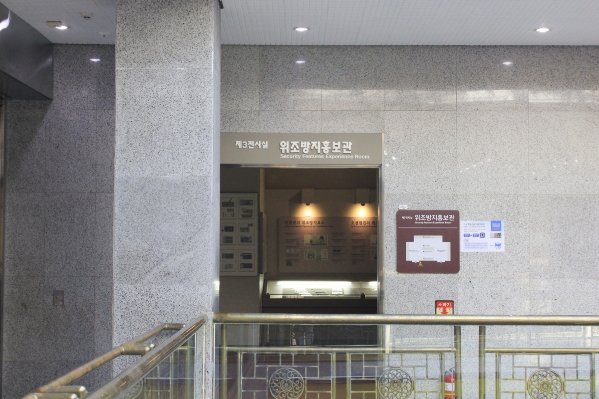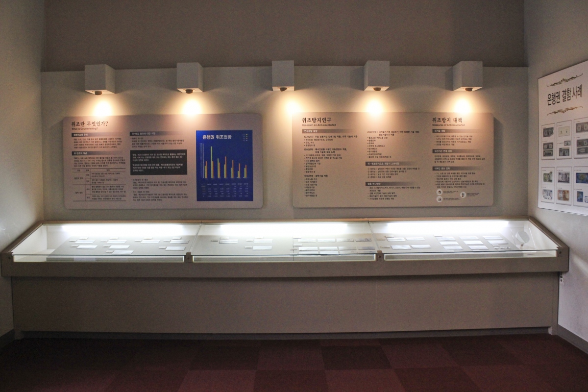 위조방지홍보관에는 위조지폐가 어떤 것인지, 위조지폐를 어떻게 판별 할 수 있는 지폐마다 숨겨져 있는 위조방지요소 등을 소개하고 있다.