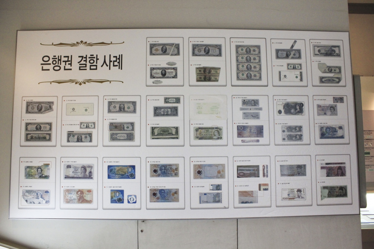 위조지폐는 아니지만 은행권에서 실수 혹은 검수 잘못으로 인해 결함이 있는 지폐들도 전시해 놓고 있다.