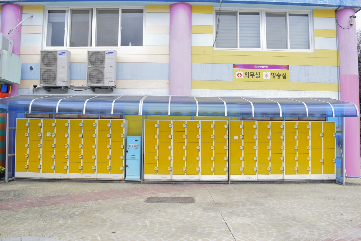 입구에는 물건 보관함, 공연장, 음식점 등이 준비되어 있어 편하게 이용할 수 있다.