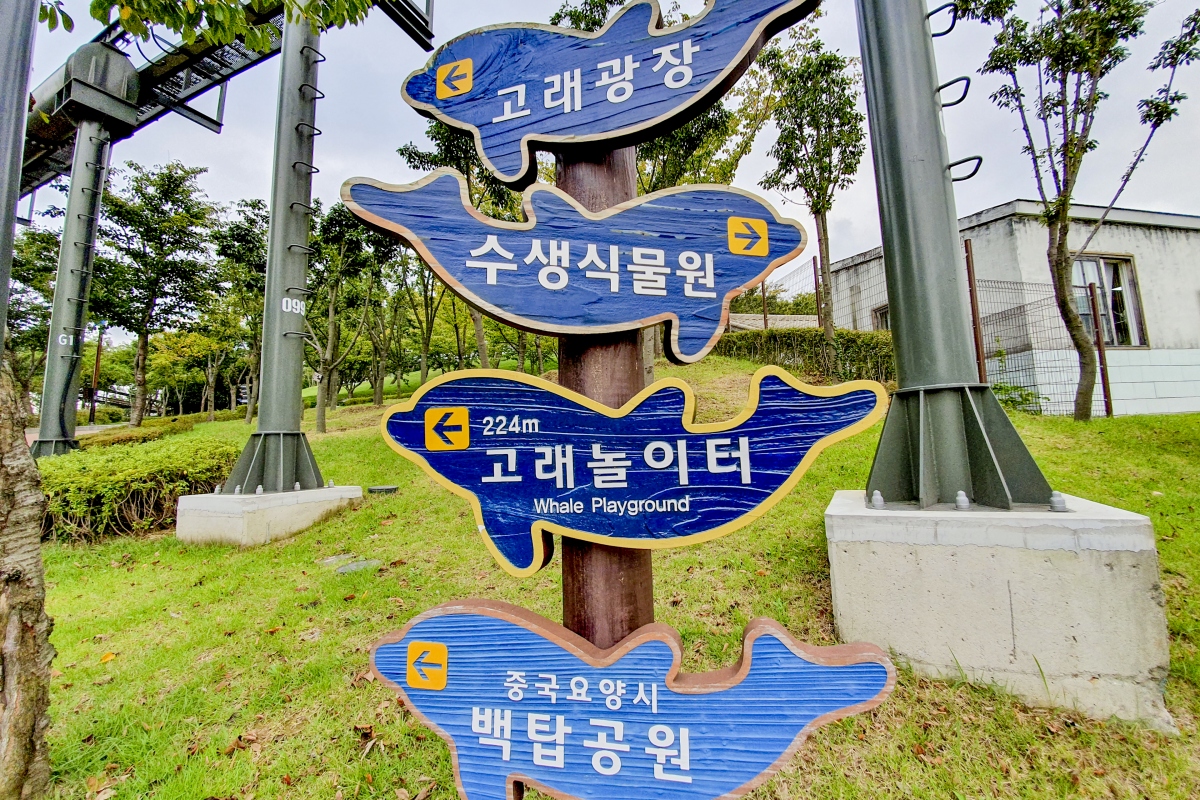 안내판도 고래모형으로 만들어져 있고 길거리에 조형물도 모두 고래모양이며 심지어 벤치까지 고래의 꼬리모양이다.
