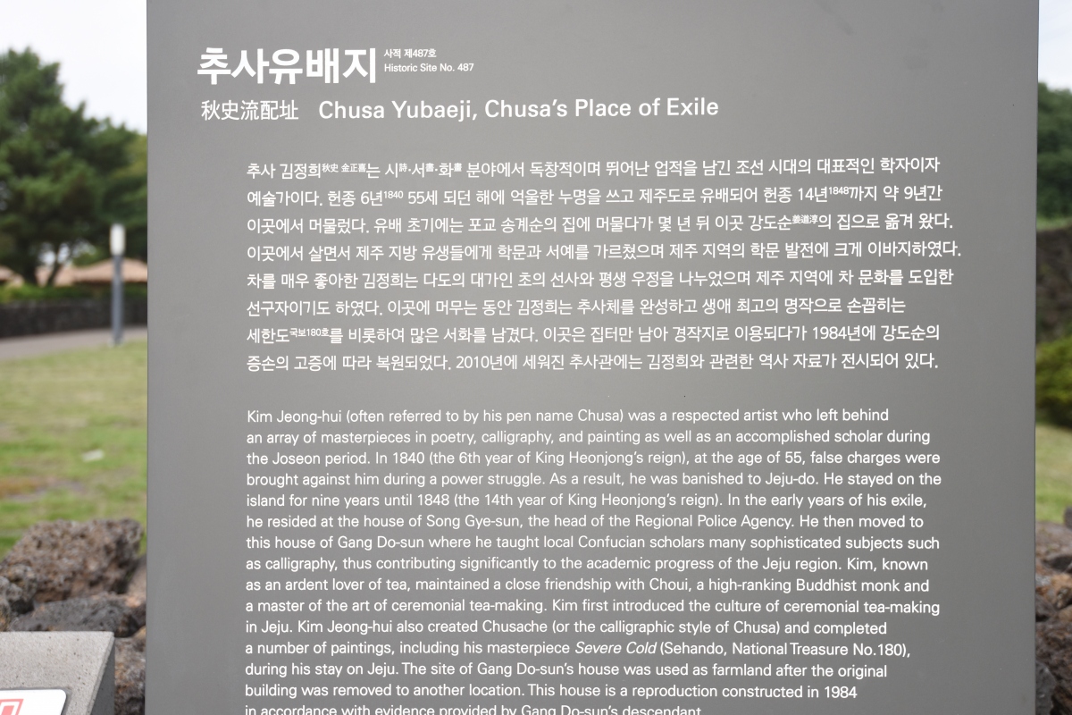 이곳 김정희 유배지는 추사 김정희가 8년 동안 제주도에서 유배생활을 하면서 추사체를 완성하고 세한도를 그린 곳이기도 하다.