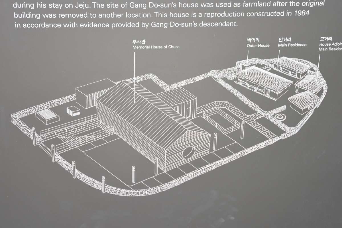 김정희유배지는 추사가 거주하던 안거리, 사랑채인 밖거리, 모퉁이 한쪽에 세운 모거리, 제주식 화장실인 통시와 대문간, 방앗간, 정낭 등으로 이루어져 있다.