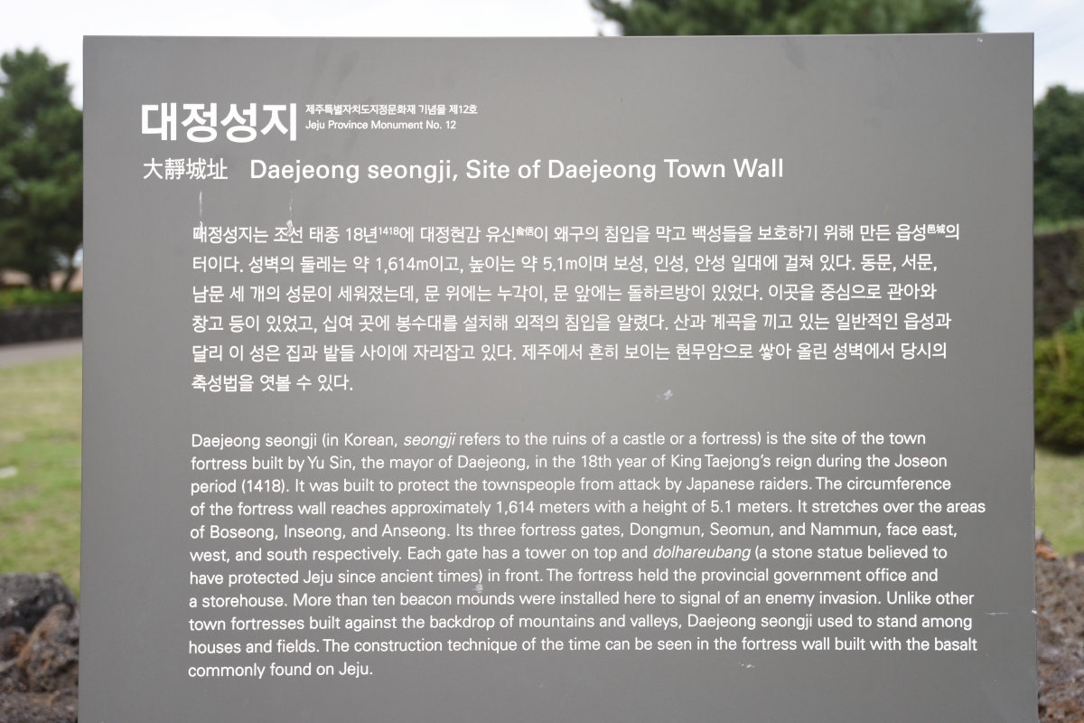 조선시대에 태종이 대정현감에게 말하여 왜구의 침입을 막으며 백성을 보호하기 위해 만든 읍성으로 높이가 대략 5.1미터로