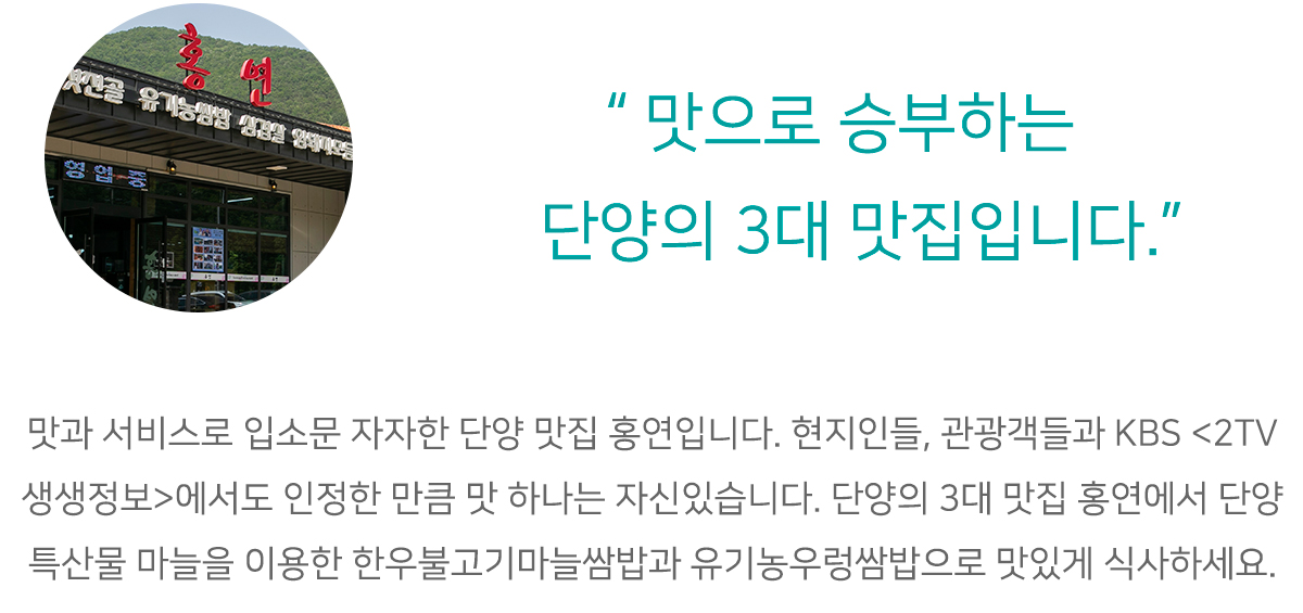 단양 3대 맛집으로 알려진 홍연은 단양을 찾는 관광객은 물론 지역 현지인들에게도 인정받고 있는 입소문 자자한 단양의