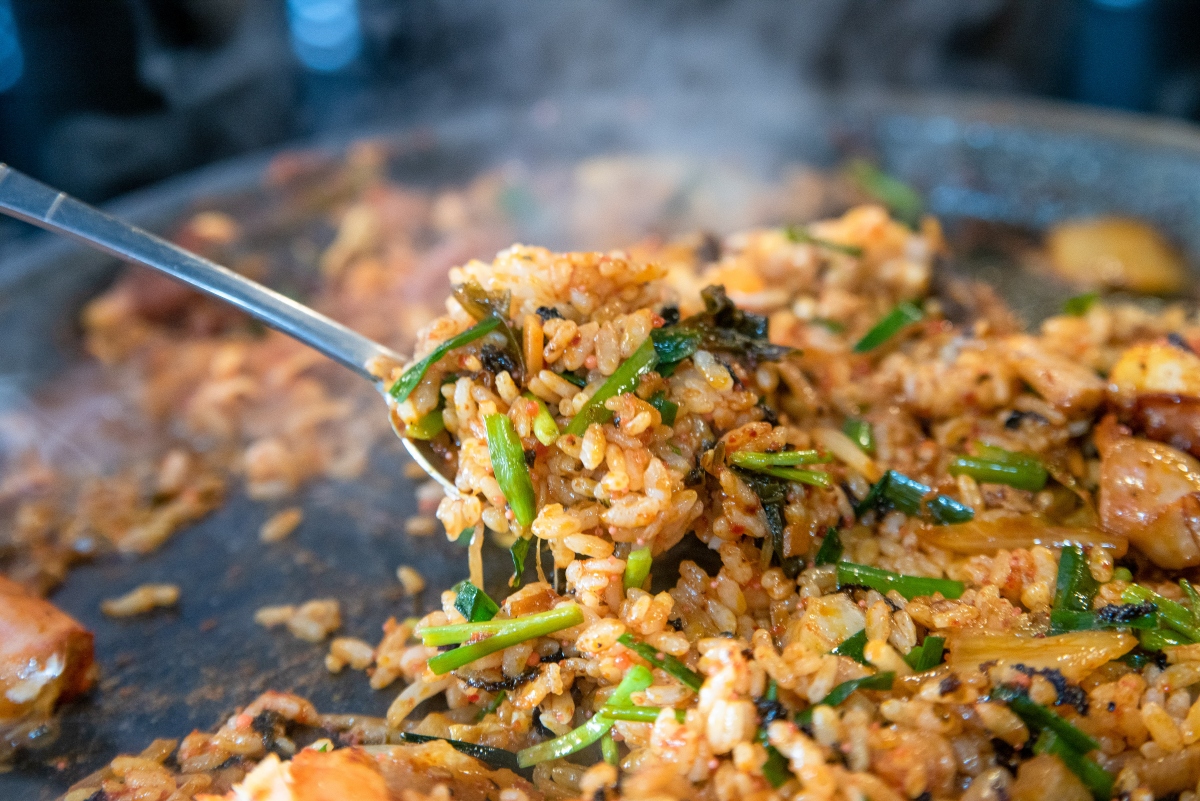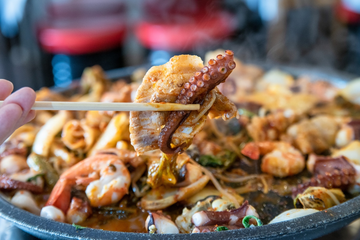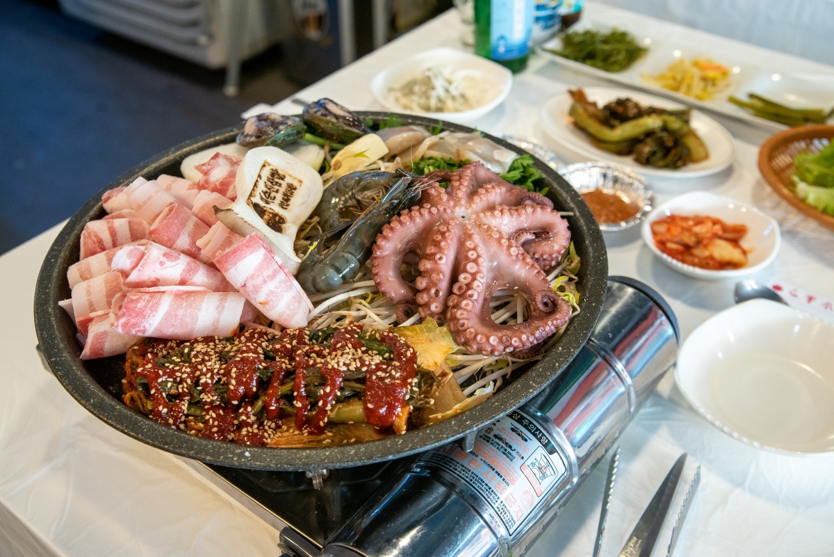 철판볶음요리인 육해물삼합은 삼겹살, 갓김치, 돌문어, 낙지, 새우, 전복, 관자, 조개 등