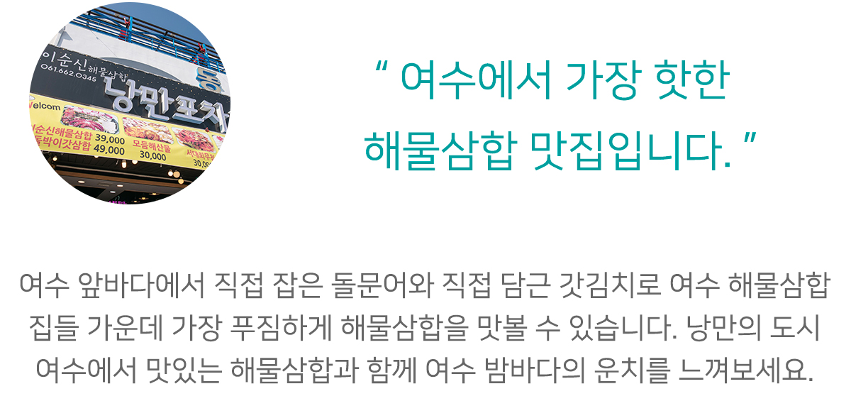 이순신해물삼합은 엑스포해양공원, 오동도, 여수케이블카, 여수돌산대교, 이신순신광장