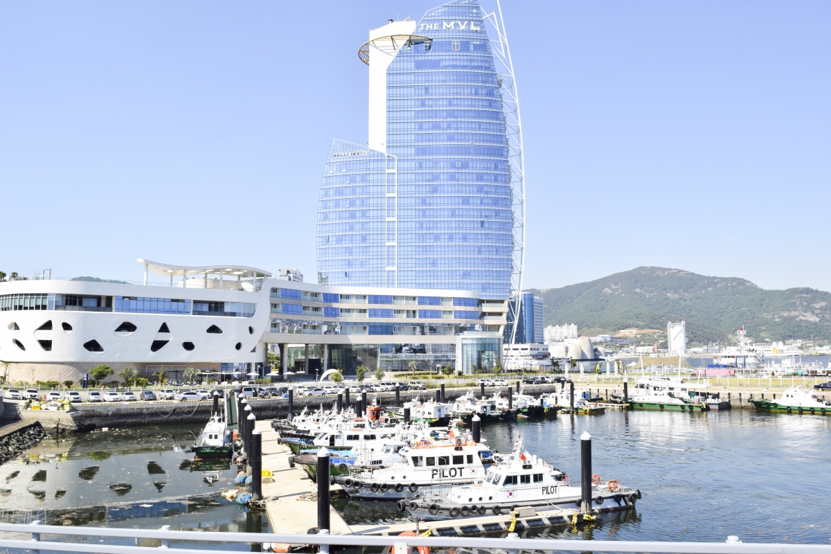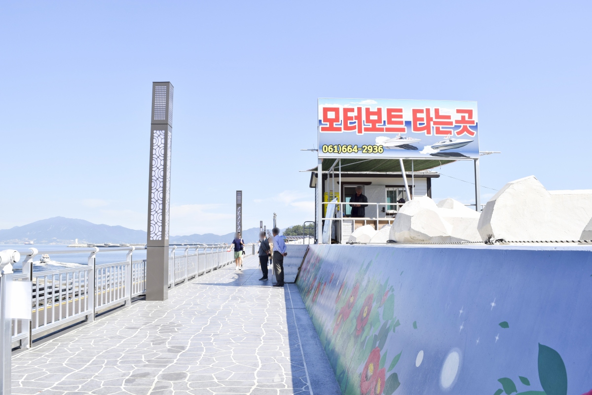 방파제를 따라 걸어 들어가면 모터보트 타는 곳이 나오고 반대쪽은 여수바다와 멋진 호텔이 있으며,