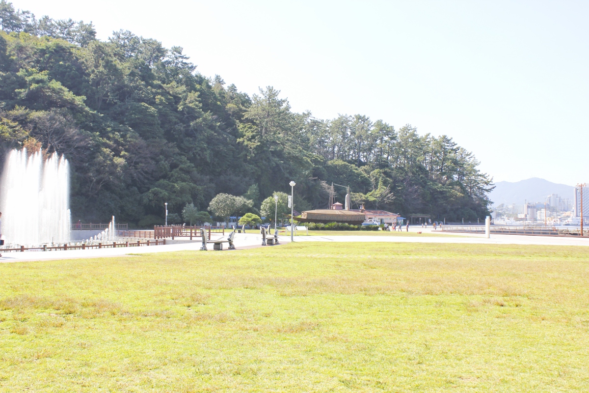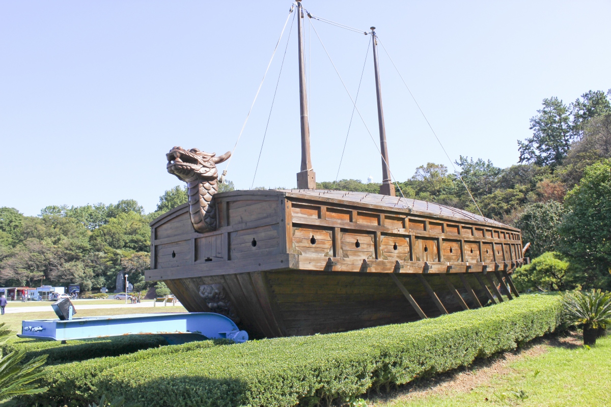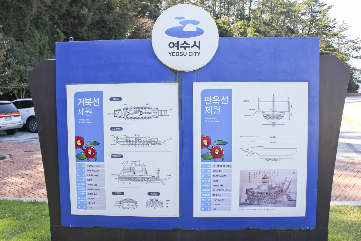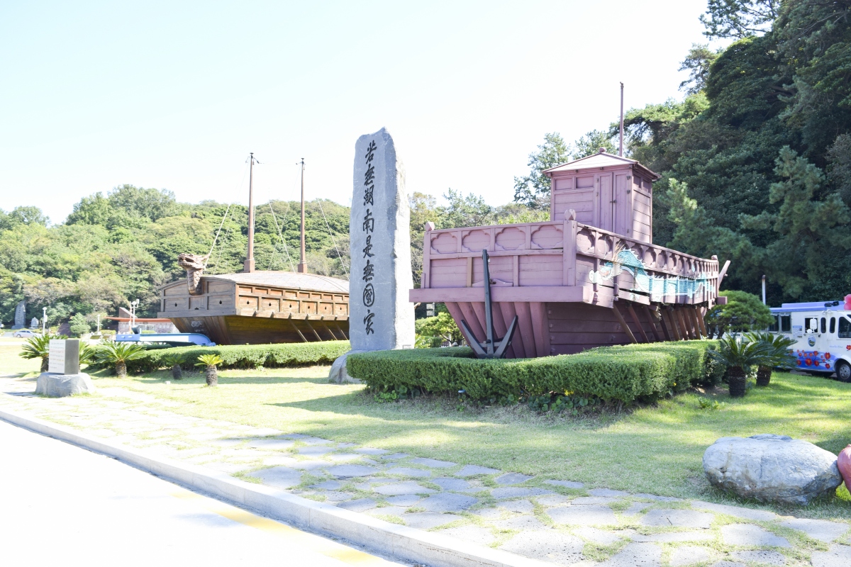 음악공원 한 켠에 거북선 모형, 판옥선 모형을 관람 할 수 있다. 두 개의 배가 나란히 있다.