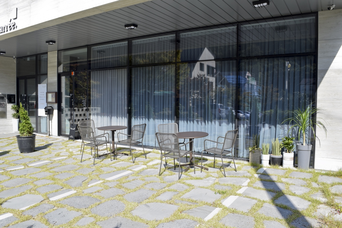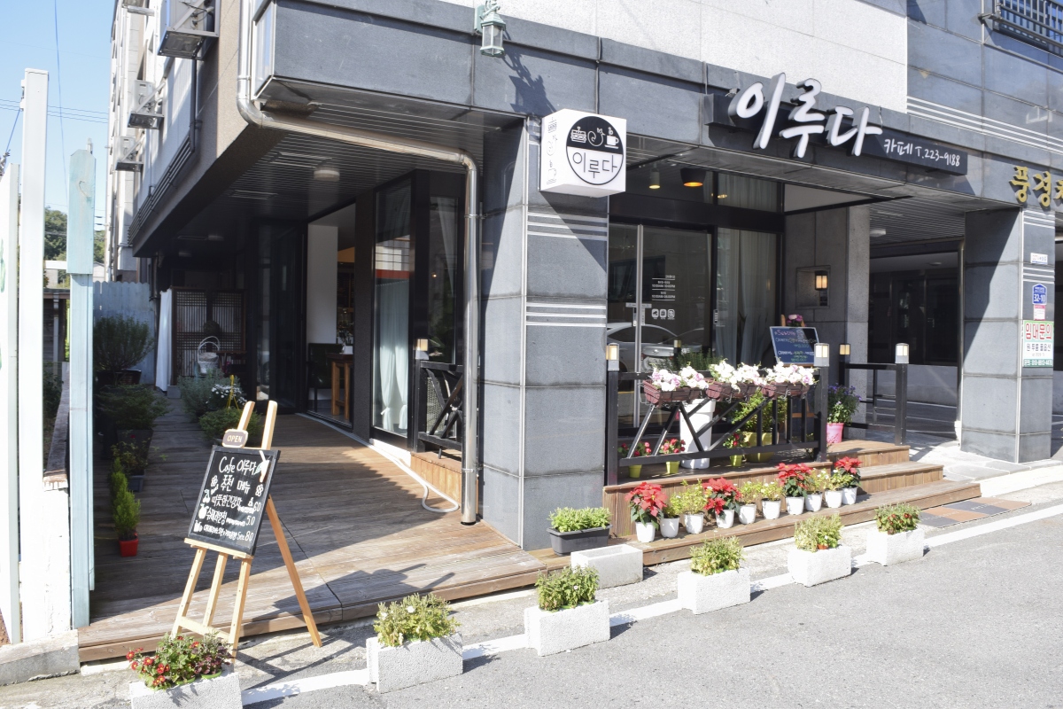 카페 앞 정원 풍경을 볼 수 있도록 유리문으로 설치한 모습이 이채롭다.