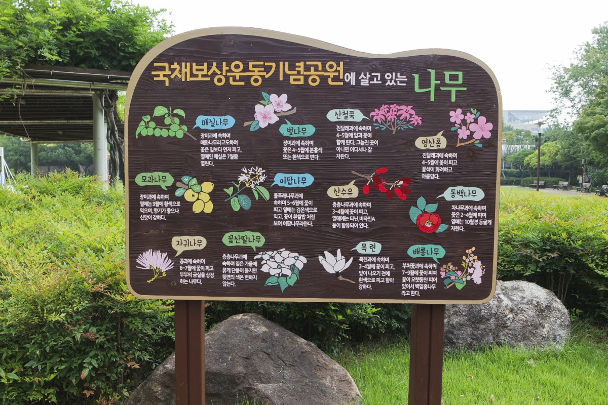 벚나무, 동백나무, 목련나무를 비롯해 산수유, 배롱나무 등의 수많은 꽃과 나무들로 울창하게 조성된 국채보상운동기념공원의 산책로는