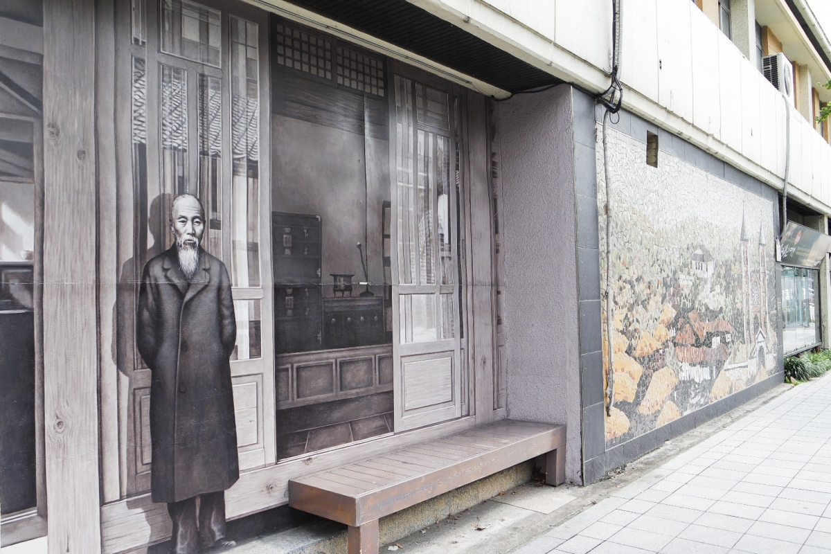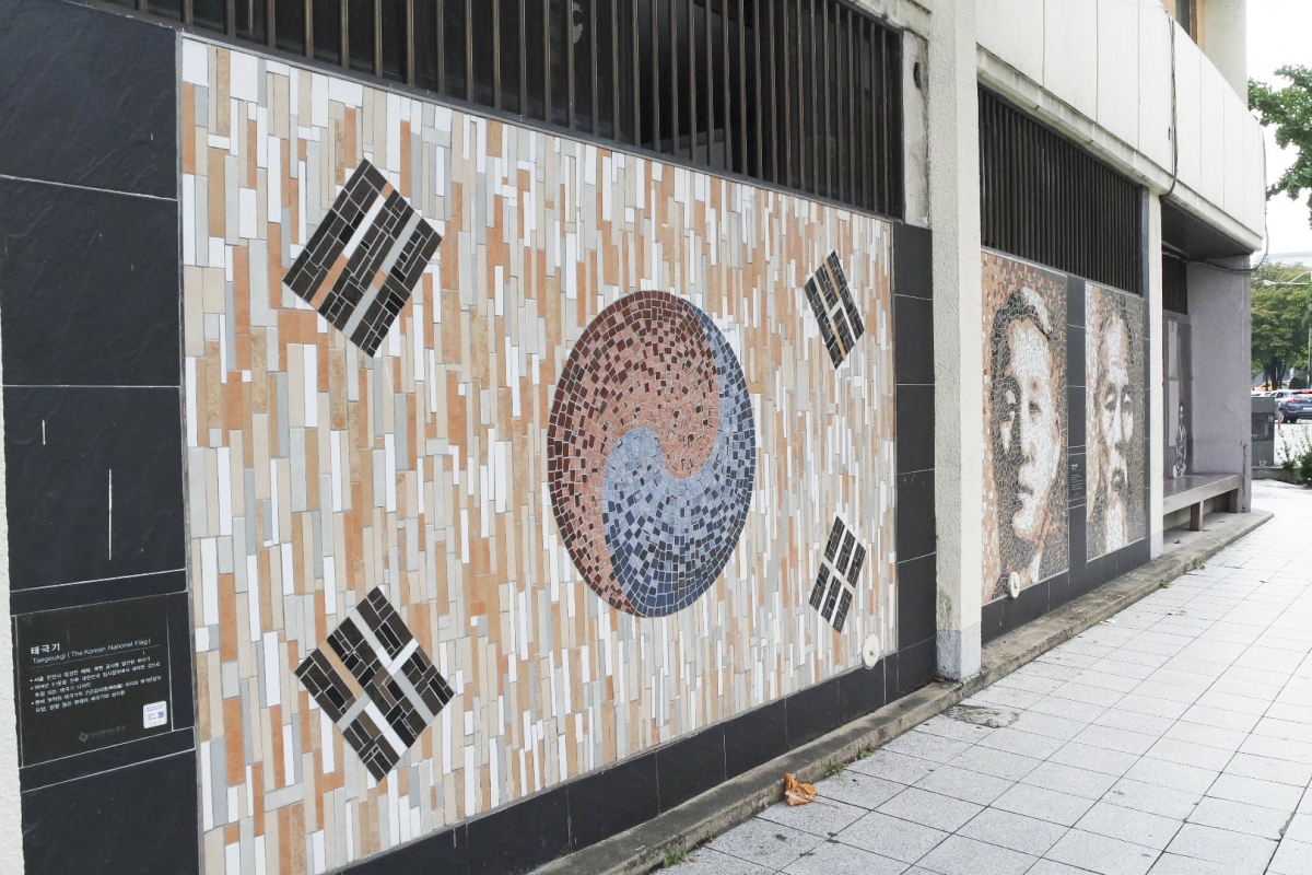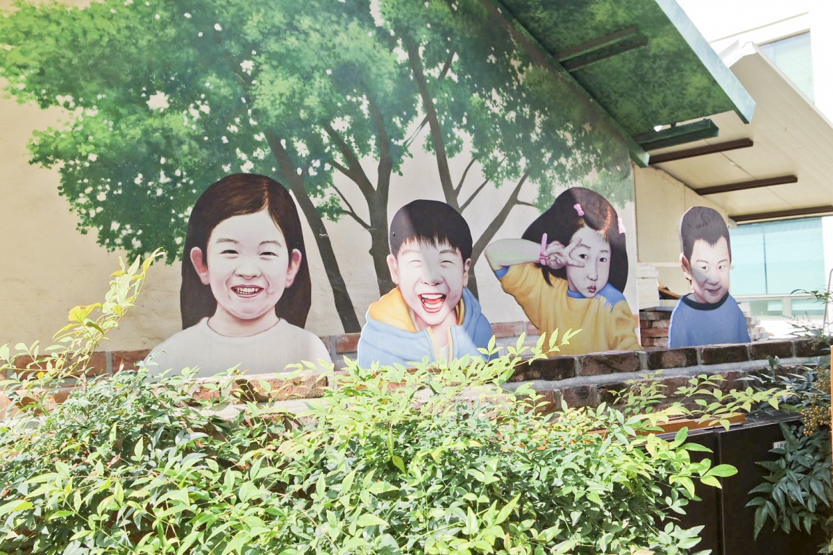 고풍스러운 모습의 한옥전시관의 담벼락에는 해맑은 웃음이 가득한 네 아이들의 모습을 볼 수 있다.