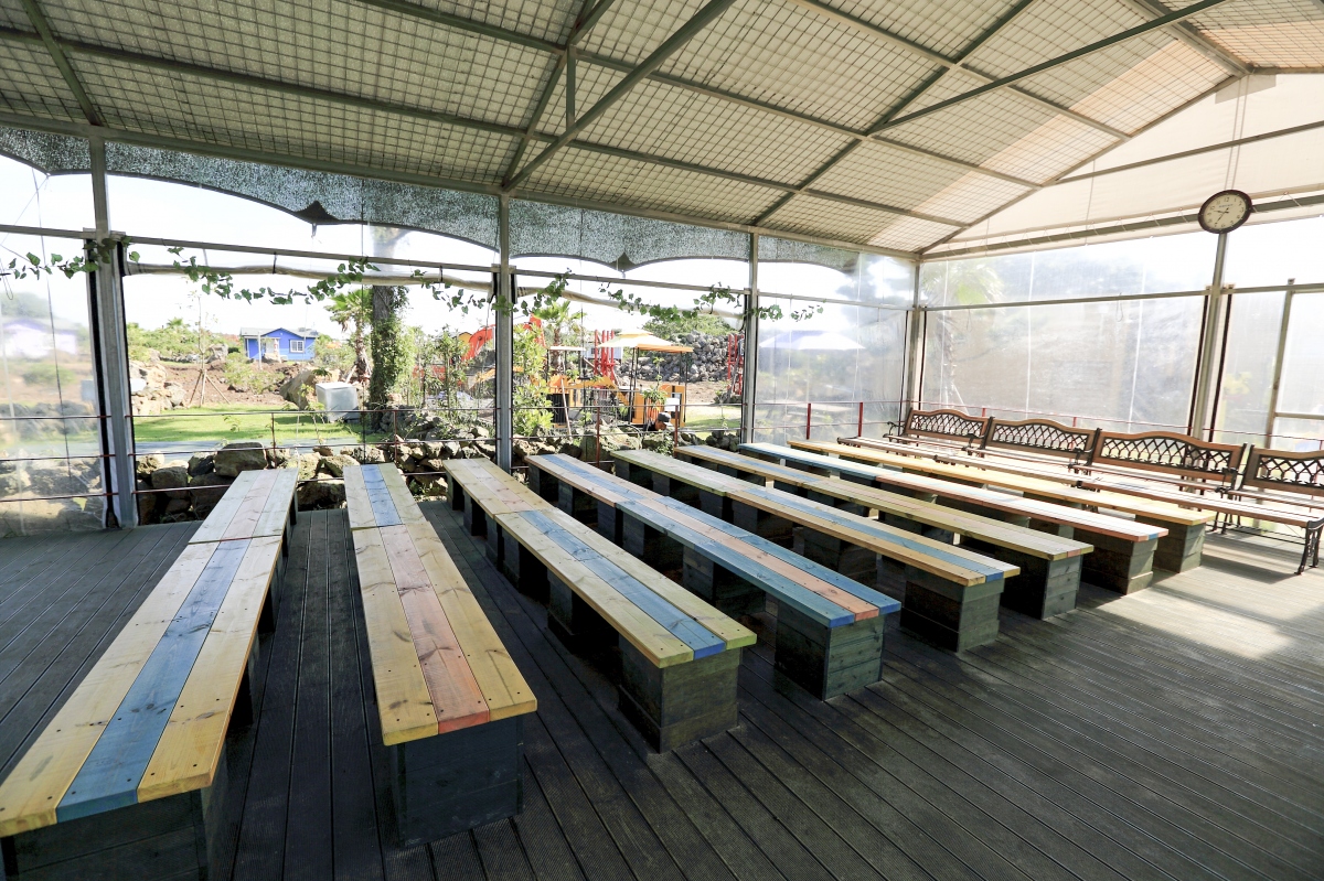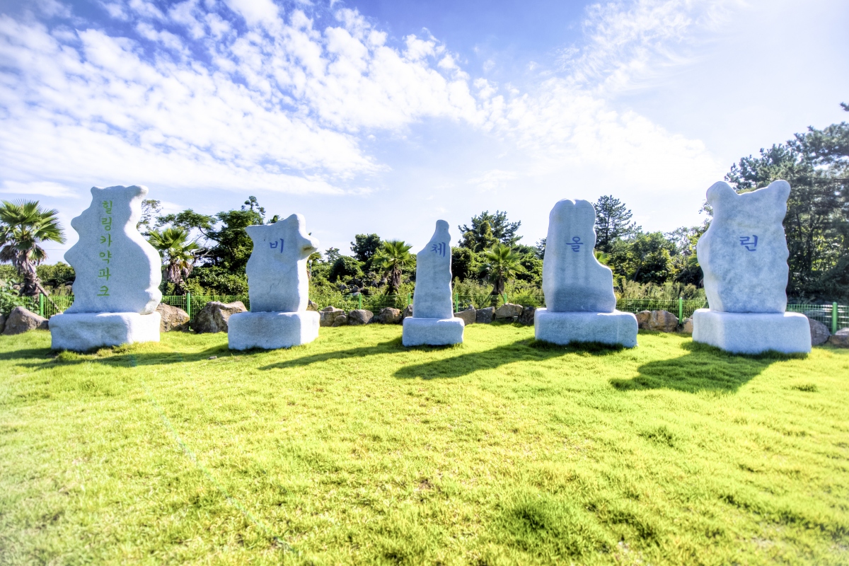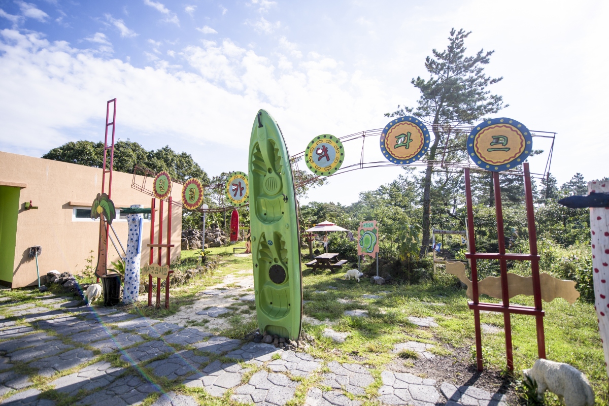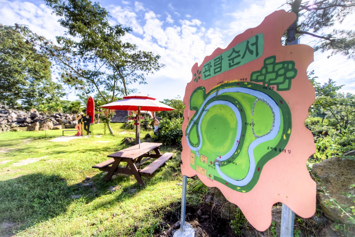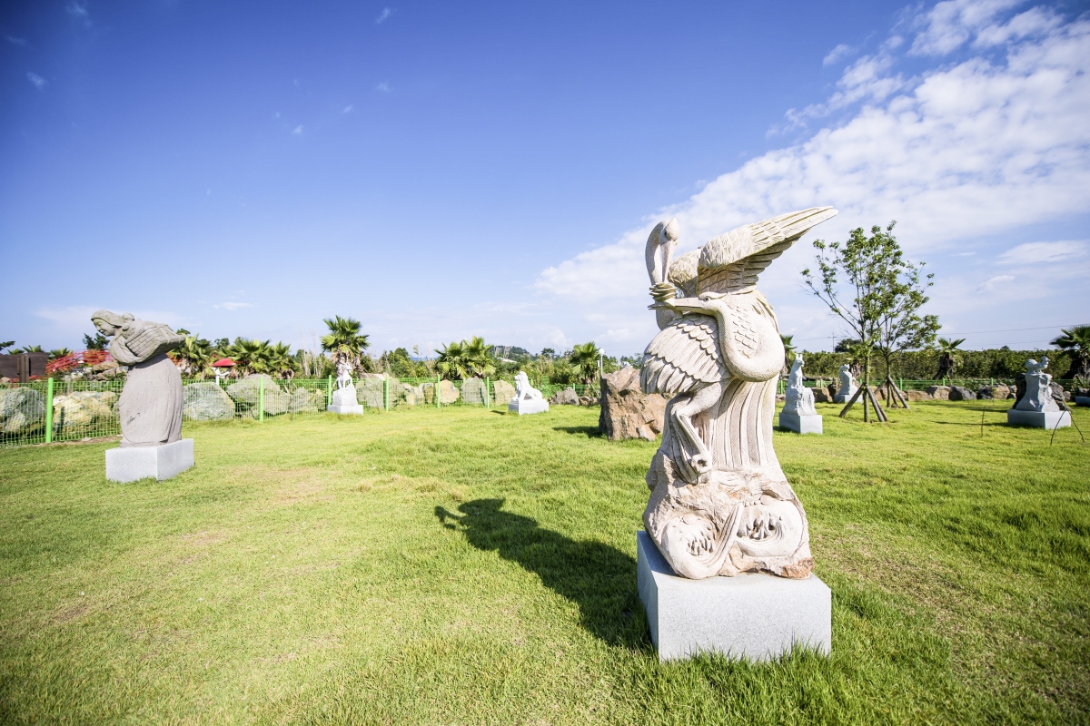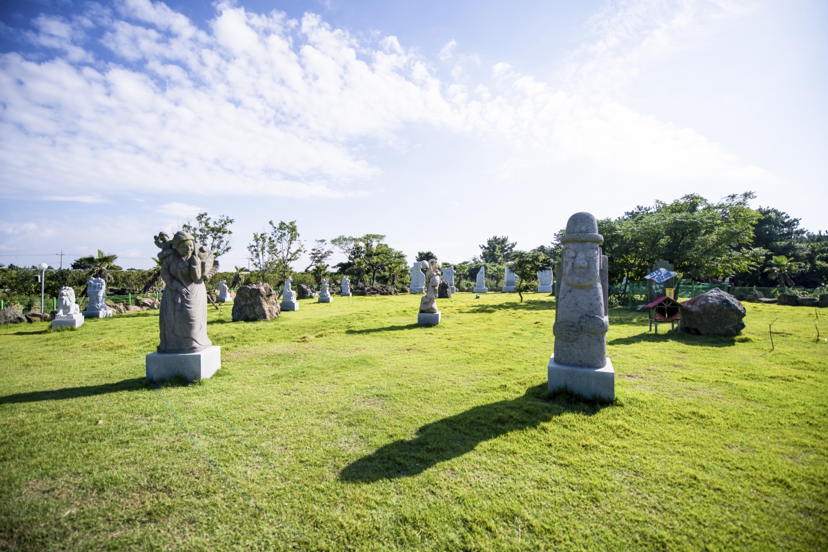 드넓은 잔디밭에는 자연상태의 기암바위와 제주를 상징하는 제주석 그리고 다양한 조형물들로 구성되어 있어 구경하는 재미가 쏠쏠하다.