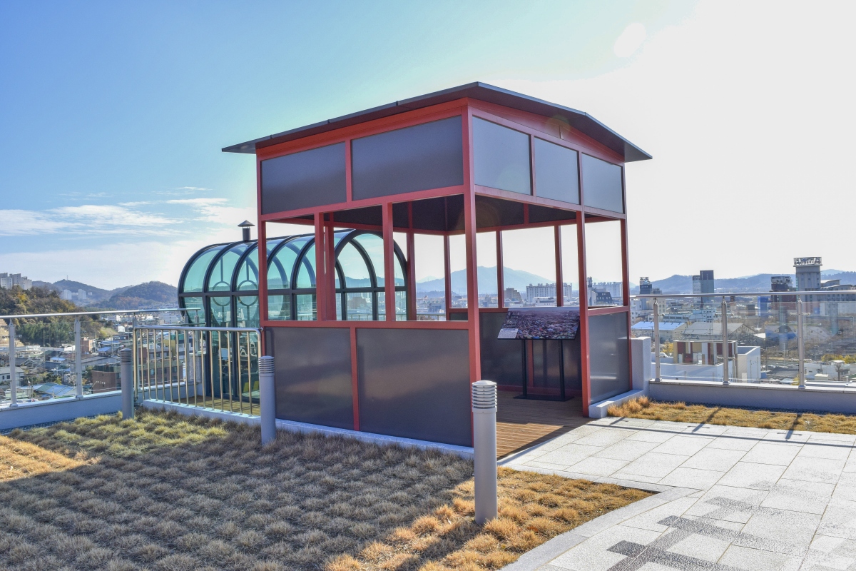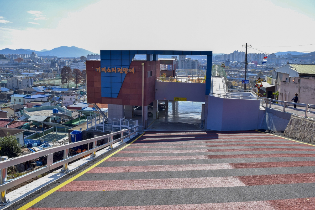 철도문화마을 제일 꼭대기에 자리 잡고 있는 기적소리전망대는 하늘 계단을 하나하나 오르면 만날 수 있는 공간이다.