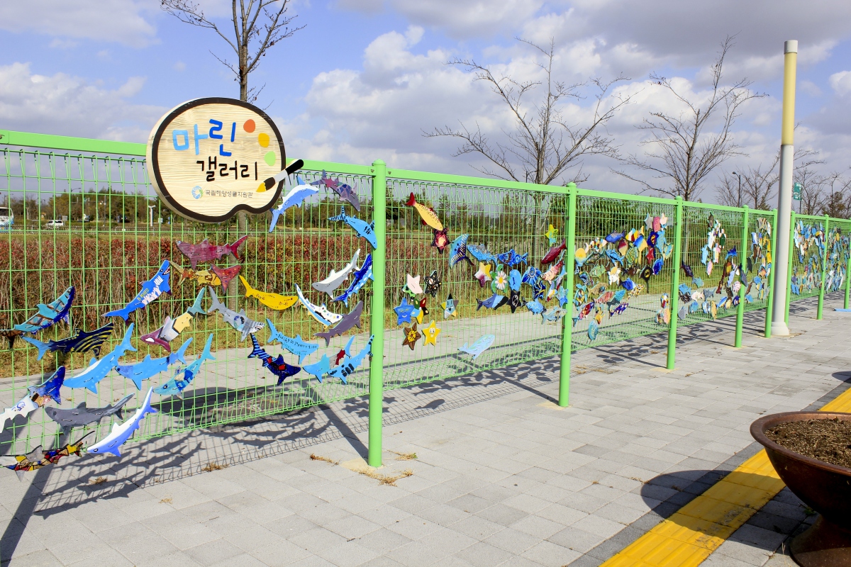 입구 앞에는 학생들이 만들어 놓은 고래나 상어 등 물고기 모양의 목판에 자신만의 개성을 살린 다양한 그림이 전시되어 있다.