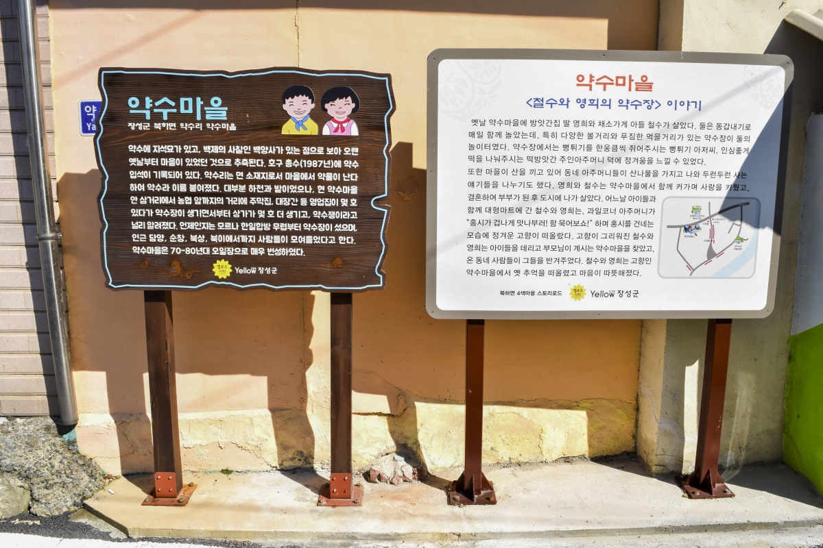 약수마을은 전남 장성의 수려한 자연 풍경 속에 아담하게 조성되어 있는 마을로 옛날 이곳에 살았다는 철수와 영희의 이야기를 알록달록 예쁜 그림으로 표현한 벽화마을이다.