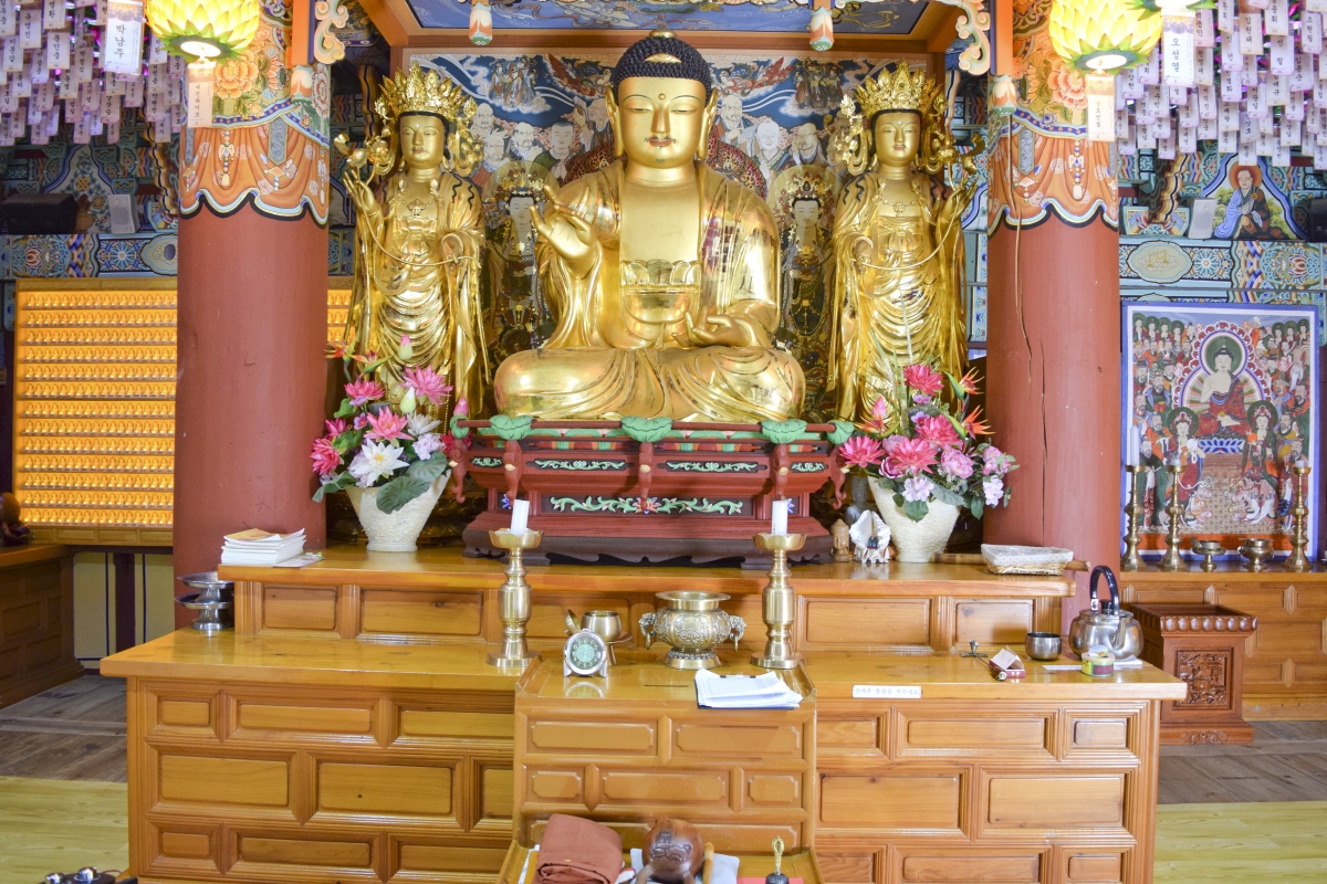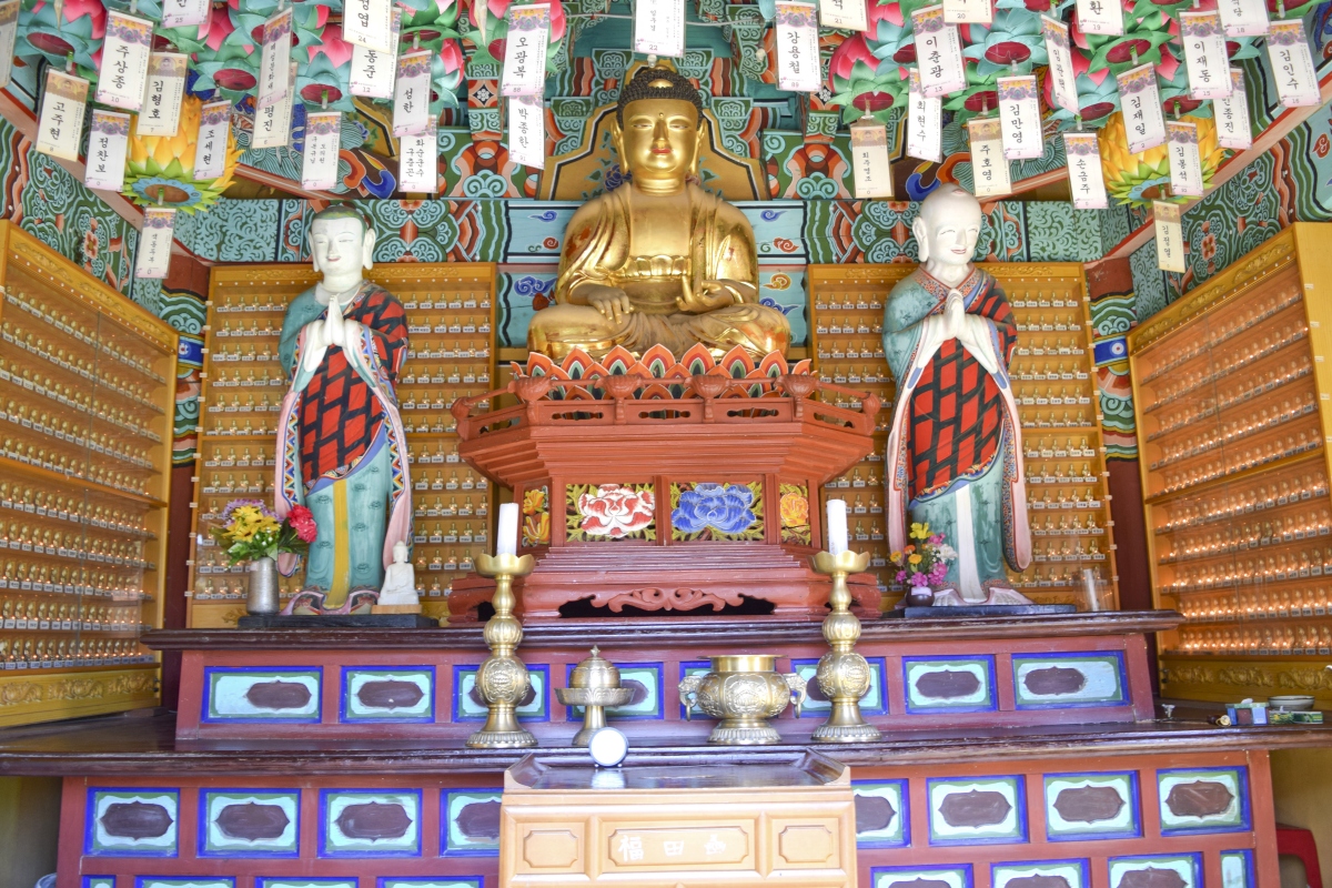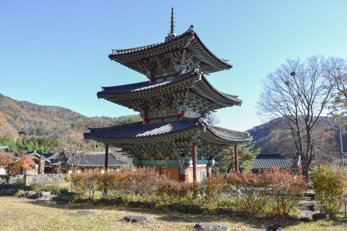 천왕문 뒤로는 우리나라에서 흔하지 않은 3층 목탑형으로 조성한 대웅전이 자리잡고 있다.