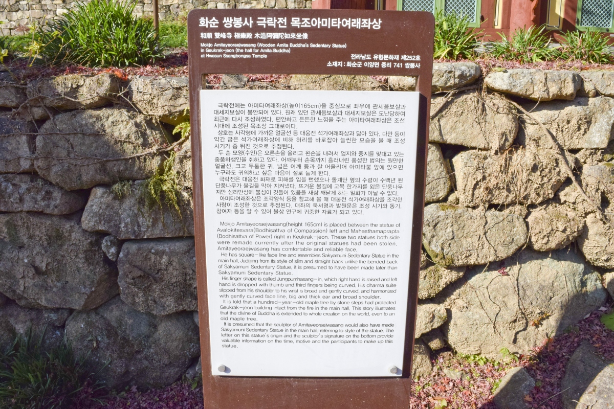 극락전에 봉안되어 있는 목조아미타여래좌상은 전라남도 유형문화재 제252호로 조선시대에 조성된 불상이다.