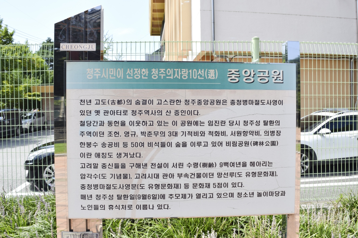청주 중앙공원은 충청병마절도사영이있던 옛 관아터로 살아 있는 옛 청주역사를 둘러볼 수 있는 곳이다.